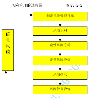 内外部环境不断变化,风险管理也随着条件的变化而调整,风险管理是一个连续的、循环的、动态的过程,主要包括建立风险管理目标、风险识别、风险分析、风险决策、风险处理等几个基本步骤,风险管理的过程图见图23-2-2。