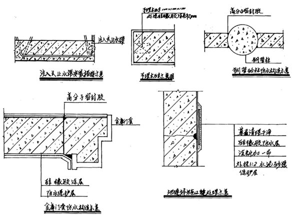 本工程地下二层是金库、变电站,且本工程地下水位较高,为此地下防水非常重要。设计的原则是:以防为主,刚柔结合,多道设防,防排结合。为确保防水效果,除在结构混凝土中掺UEA膨胀剂,加强自防水能力外,还在施工缝处,埋置德国产罗美克思(ROMEX)膨胀橡胶止水带,在带中加注以复合聚氨脂为基础的双注射树脂;对混凝土施工缝可进行耐火密封,堵塞混凝土中的渗水孔,达到抗渗的要求。另外在本工程地下二层外墙衬墙的内侧、与底板相连的混凝土内墙两侧、零层板下及1.5m厚的基础底板上均做硅橡胶防水涂层,作为本工程的第二道防水。硅橡胶防水涂料,是一种复合防水涂料,具有防水性能好,适用性强,经久耐用,无毒副作用,安全可靠,操作方便.可喷、滚、涂。硅橡胶防水涂料,在本工程的使用,必须由专业队伍施工,以保证该工程的防水质量。
