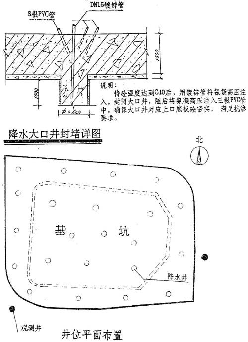 基础埋深-9.200m~-10.7m,桩基为Ф800灌注桩,现浇钢筋混凝土底板。厚1.5m,钢管混凝土桩、地下连续墙兼作围护,楼板为密肋梁板结构。地下室防水设计为刚柔结合,防排结合,因地制宜,综合防治的方法。地下室混凝土均为S8抗渗混凝土自防水,经界面处理抹刚性硅类防水砂浆,刷硅橡胶涂层,地下二层做卵石排水层。屋面为硅橡胶涂层防水。