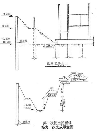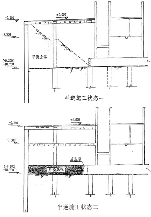 该工程地势狭窄,西南面邻建筑物,在北面临主要交通干道,地下水位高,基础土质差,基础埋深为—9.2至—10.7m,根据以上情况,基坑边坡设计采用永久性地下连续墙围护。主楼地下室部分采用正施法施工,±0.00层所对应的其它地下室部分,即裙房地下室部分采用逆作法施工。利用±0.00层处对应的地下室土体,由该处土体平衡弥补地下连续抗倾覆能力的不足,保证主楼地下正施部分的安全.正逆作法施工的接头处留置后浇带,待±0.00层处的梁板柱浇筑完.强度达到100%后,再进行±0.00以下的逆作法施工,这样既保证了主楼部分的施工安全,又保证了工程的施工工期。逆作法施工技术,我们是第一次接触,所以我们每一位工程技术人员特别是该工程的主要技术负责人和项目经理,在进行逆作法部分施工时,要特别认真细致,多与设计联系,向有经验的单位学习。遇到问题及时向公司请示。按照设计逆施的部位,编制详细的施工方案,画出逆作法施工部位的节点详图,说明施工程序及做法,经讨论后进行实施。项目经理部要根据施工情况总结经验,锻炼一批人才,以利今后类似工程的再施工。