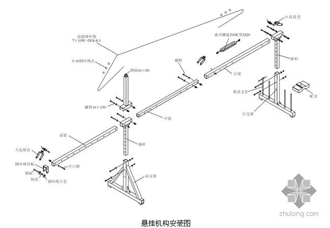 6.1 悬臂机构是由80×80×4方钢管1根,70×70×4方钢管2根,前、后支架上主柱加强钢丝绳及配重块组成,用M16螺栓连接组装好后,支放在屋内。横梁连接好后总长5800mm。工作钢丝绳及安全钢丝绳从悬臂前端垂放下,每台吊篮2个悬臂。