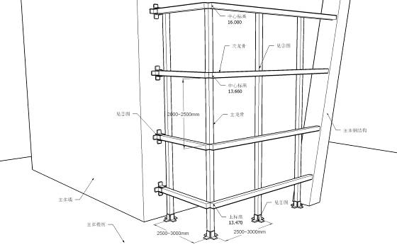 由于本工程三层层高为6.9m,根据设计分格要求,三层清水混凝土板下部不落地,同时分为上下两块。由于预制清水混凝土挂板挂设位置与混凝土结构有一定的距离,故在三层焊接钢结构骨架,作为清水混凝土挂板的支撑。
