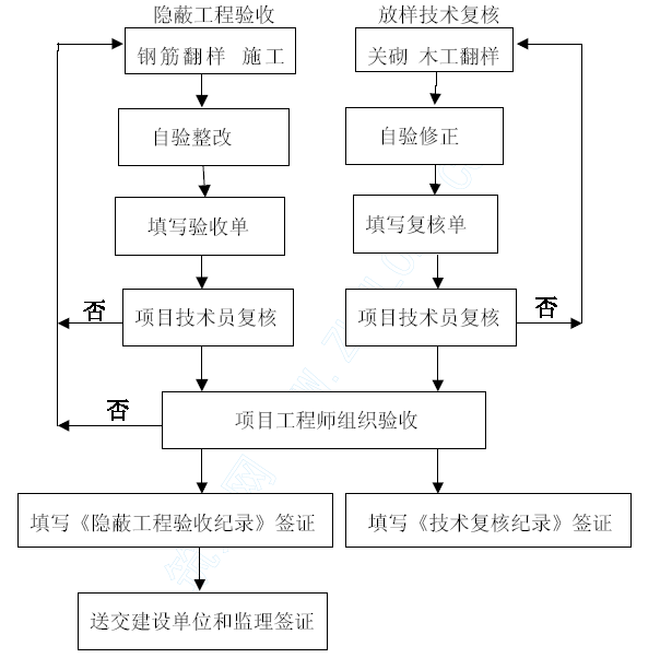 工序和分项工程施工完成,乙方自检无误后,提交技术复核资料向业主、监理师申请复核。业主、监理师对照复核质量符合要求后予以书面确认。若发现与规范、规程、标准等要求不符,则书面指令乙方返工,直到符合要求后再行复核。