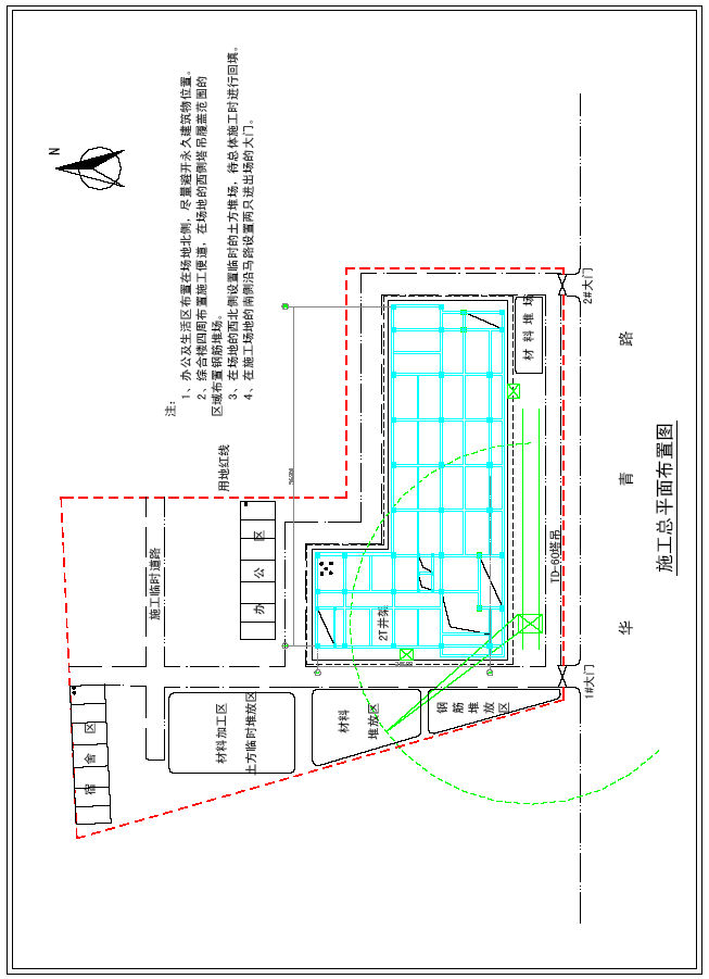 本工程在华青路侧开设两只大门,作为进出场地的主要通道。其中1#大门作为钢筋等施工材料主要运输通道,2#大门为人员进出的主要通道。