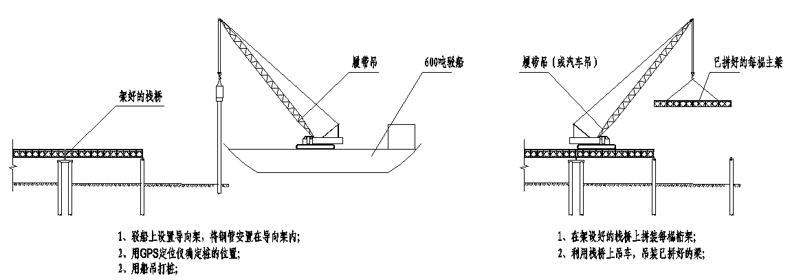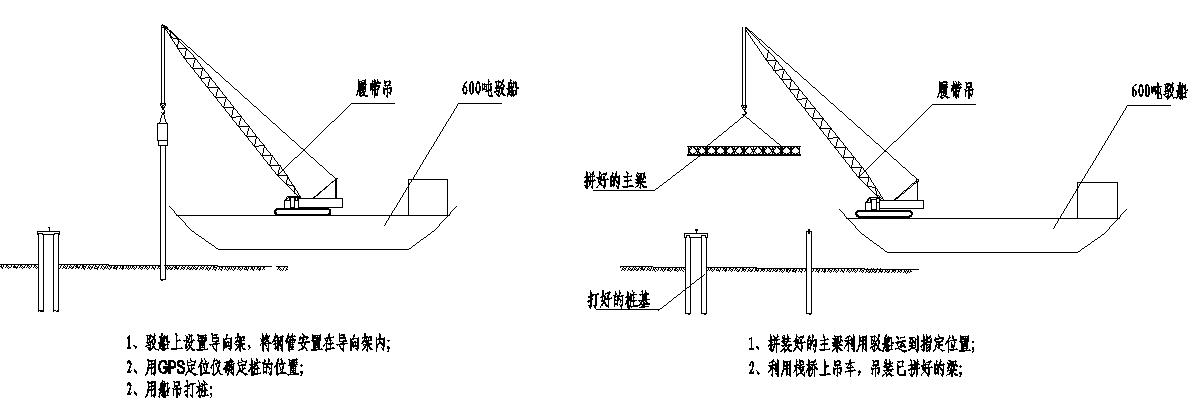 钢管桩下沉采用履带吊上驳船的方式施工,施工示意图参见图3.3.2。整根钢管桩一次性打设到位。首先驳船抛锚定位,然后起吊钢管桩,同时由测量组用GPS指挥驳船精确定位,测量员复测驳船头导向架位置及垂直度。测量员复核导向架垂直度和空间位置满足设计要求后,船吊打沉钢管桩至设计标高。在打设钢管桩的过程中要不断的检测桩位与桩的垂直度,发现偏差要及时纠正。按此方法,逐步完成每跨钢管桩的施工。
