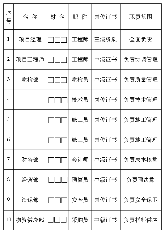 主要技术、管理人员配置表