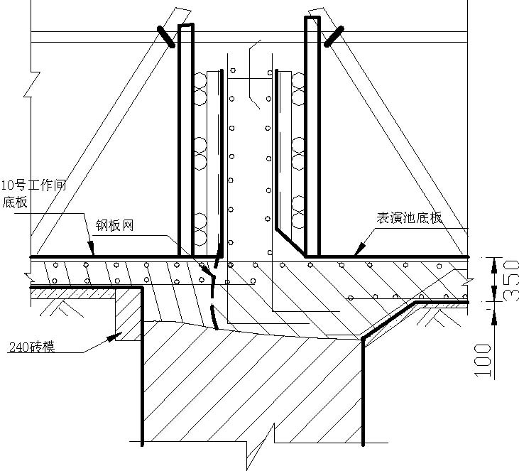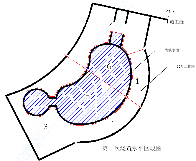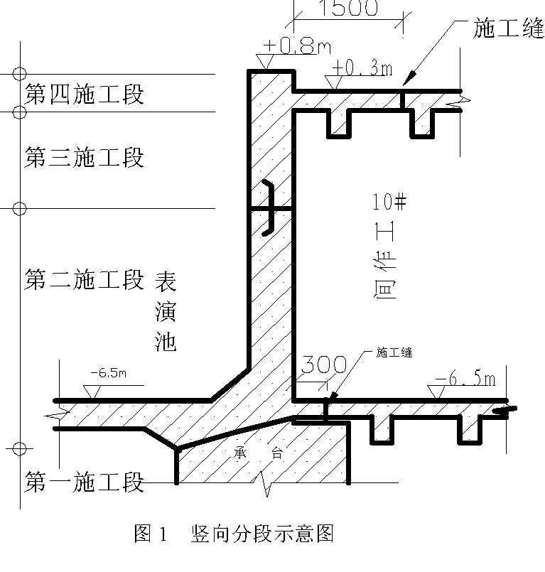 工作间底板与表演池池壁外侧相接处可留竖向施工缝,该缝以下正是6个施工区段的分