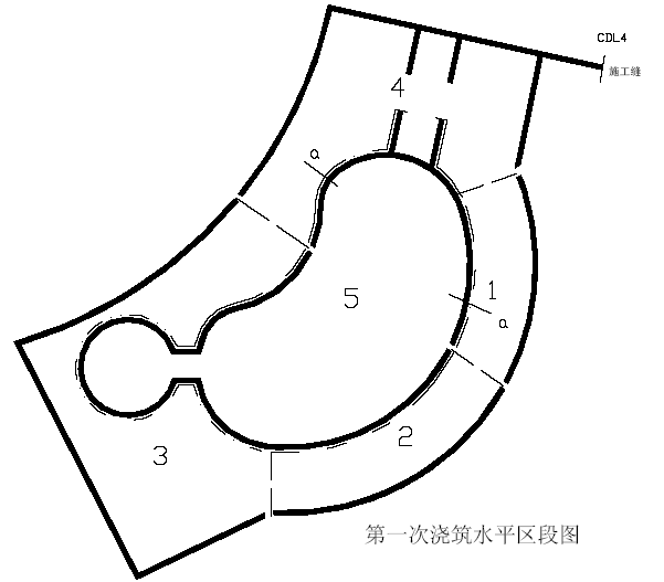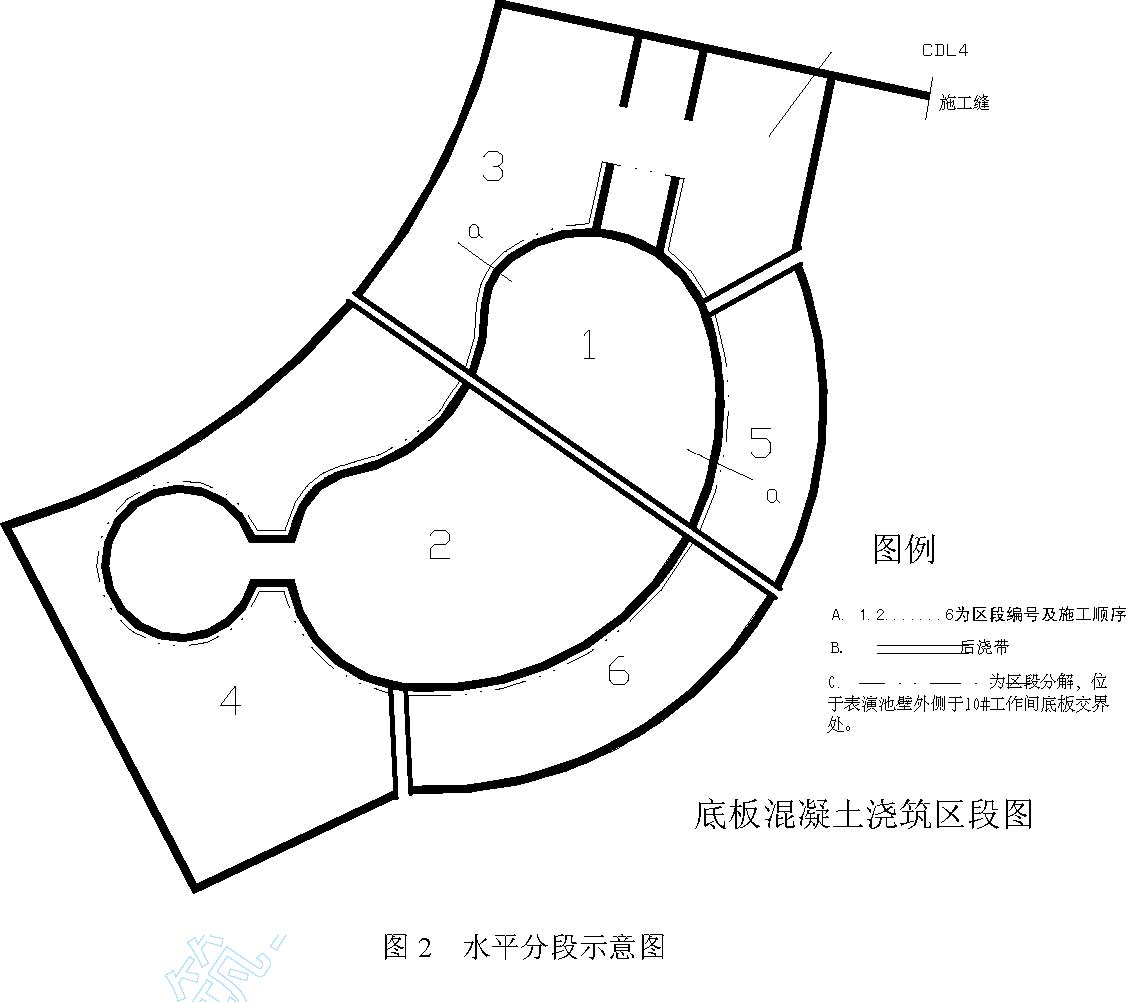 考虑到上述特点,除在混凝土配合以设计时考虑改善自身性能外,在混凝土浇筑方面必须采取有效的防止温度变形的措施,这些措施包括:分层浇筑、留后浇带、有组织的留施工缝。