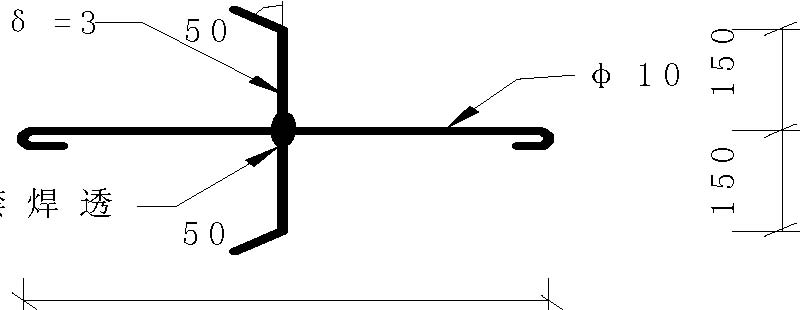 板支承于表演池承台上,支承宽度达1000mm 宽;工作间顶板距承台上表面为200mm,而工作间板厚150mm,这就是说,浇筑混凝土后,这部分1000mm 宽范围内底板实际厚度为200mm 。从混凝土工作量来看,除表演池部分1、2 区段混凝土近400m3 外,其余4 个区段的混凝土量均在100m3 左右,均可控制不出现施工缝,浇筑混凝土时应先浇筑底板,后浇筑池(墙)壁,一般先浇筑400mm 宽底板,再返回浇筑池(墙)壁,依次交叉推进。在浇筑1、2 区段混凝土时,表演池壁上应设置钢板止水带,止水带用δ=3mm 钢板预制,现场安装拼焊沿池壁长方向轴线焊成封闭型,止水带按图11 加工。