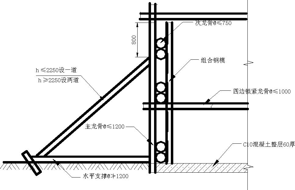 以组合钢模为主,木模板为辅,用于接头处的木模板,板厚为δ=50mm。模板加固用钢管龙骨D=48mm 。沿纵向及水平方向分两层加固,次龙骨间距A≤750mm, 主龙骨间距A≤1200mm。凡水平龙骨四周能交圈布置的,应连为整体。为防止模板侧向弯曲和位移,必须设水平支撑及斜支撑。水平支撑置于模板下部,与扫地杆相连。斜支撑的设置:当模板有效高度≤2000mm 时,在800mm 高度增设一道,1600mm 高度增设一道,当模板设计为2500mm 时,在2400mm 高度增设一道。水平支撑及斜支撑间距与主龙骨间距相同,均≤2000mm 。