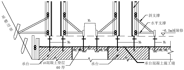 第一施工段在底板下皮以下,包括承台及连系梁;第二次施工段包括全部底板且及300mm 高池(墙)壁;第三施工段至10 号工作间顶板下皮,由于配套专业图纸目前尚未供图,故第二次,第三次施工现在只做施工准备,等待建设单位指令。