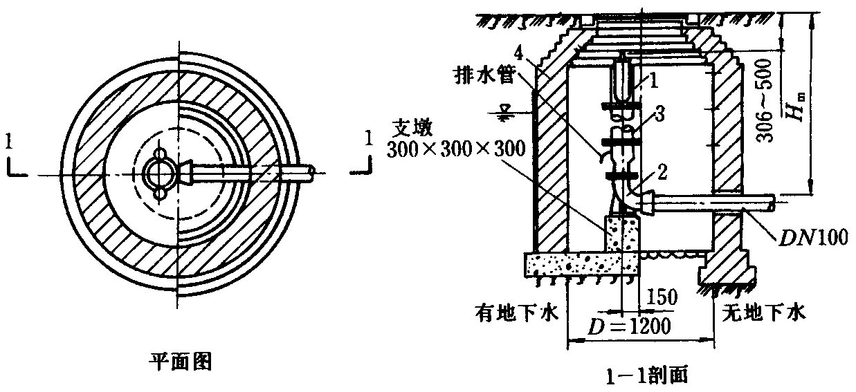 1—消火栓;2—弯头底座;3—法兰接管;4—圆形阀门井