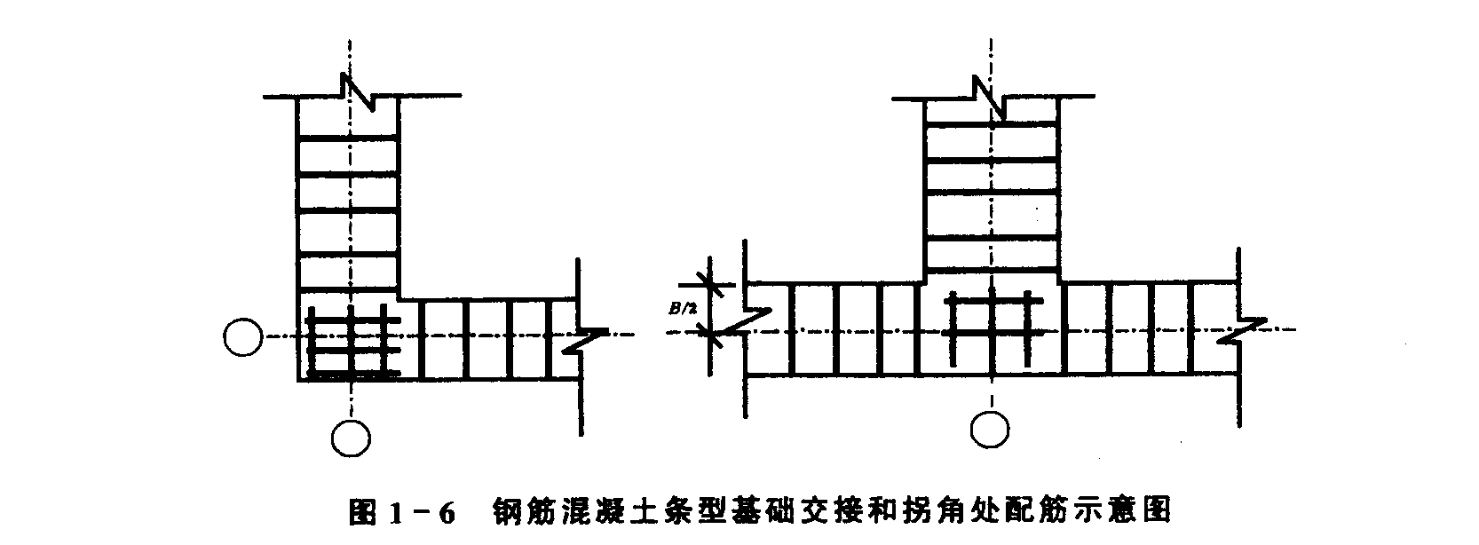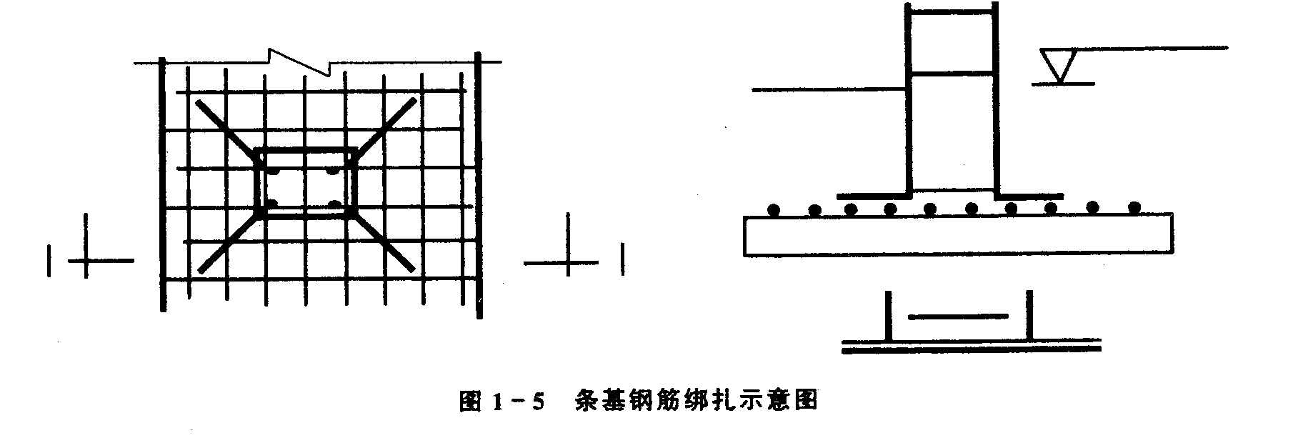 垫层浇筑完成达到一定强度后,在其上弹线、支模、铺放钢筋网片。上下部垂直钢筋绑扎牢,将钢筋弯钩朝上,按轴线位置校核后用方木架成井字形,将插筋固定在基础外模板上;底部钢筋网片应用与混凝土保护层同厚度的水泥砂浆或塑料垫块垫塞,以保证位置正确,表面弹线进行钢筋绑扎,钢筋绑扎不允许漏扣,柱插筋除满足冲切要求外,应满足锚固长度的要求。当基础高度在9OOmm以内时,插筋伸至基础底部的钢筋网上,并在端部做成直弯钩;当基础高度较大时,位于柱子四角的插筋应伸到基础底部,其余的钢筋只须伸至锚固长度即可。插筋伸出基础部分长度应按柱的受力情况及钢筋规格确定。与底板筋连接的柱四角插筋必须与底板筋成45°绑扎,连接点处必须全部绑扎,距底板5cm处绑扎第一个箍筋,距基础顶5cm处绑扎最后一道箍筋,作为标高控制筋及定位筋,柱插筋最上部再绑扎一道定位筋,上下箍筋及定位箍筋绑扎完成后将柱插筋调整到位并用井字木架临时固定,然后绑扎剩余箍筋,保证柱插筋不变形走样,两道定位筋在打柱混凝土前必须进行更换。钢筋混凝土条型基础,在T字形与十字形交接处的钢筋沿一个主要受力方向通长放置。见下图: