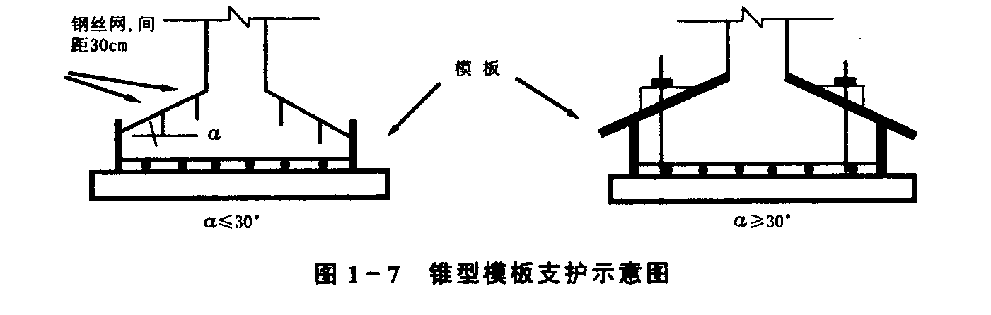 钢筋绑扎及相关专业施工完成后立即进行模板安装,模板采用小钢模或木模,利用架子管或木方加固。锥形基础坡度>30°时,采用斜模板支护,利用螺栓与底板钢筋拉紧,防止上浮,模板上部设透气及振捣孔,坡度≤30°时,利用钢丝网(间距30cm),防止混凝土下坠,上口设井字木控制钢筋位置。