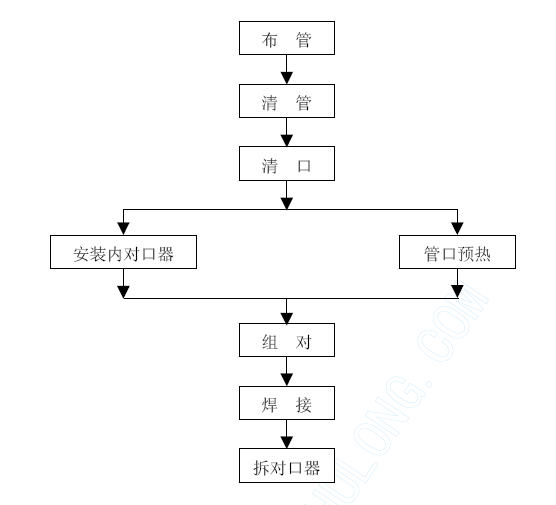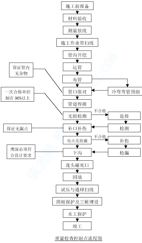 设计交桩→施工测量放线→修筑施工便道→施工作业带清理→运管与存放→布管→管道组对→焊口预热→焊接→防腐补口→管沟开挖→细土垫层回填→下沟→回填→三桩埋设→干线阀室清管、试压→地貌恢复、水工保护