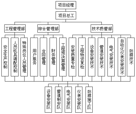工程管理部:负责施工人员上岗资格管理及组织培训,全面协调现场施工质量与工期、安全的矛盾,负责成品保护、机工具管理及保证物资采购质量。