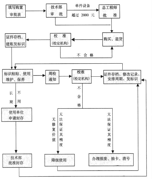 2.1 设备购置前,由使用单位计量员提出书面申请,填写购置审批表一式两份,由技术部审核,超过2000元的单件设备,由总工程师批准后方可购买,购置文件交技术部存档,详见图18一1计量设备购置、检验、使用流程图。